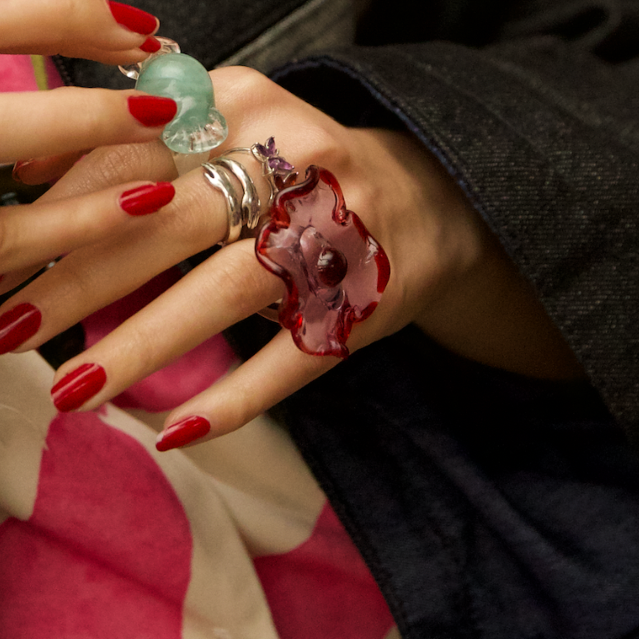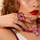 Inspirada en las flores que decoran las tortas vintage, esta pieza llega en versión maxi para robarse todas las miradas. Cada flor está hecha a mano en vidrio, con formas irregulares que la hacen completamente única. Es el anillo coqueto y dulce que va a destacar tu look sin esfuerzo.